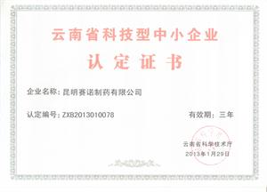 • ??? 2013年1月29日,昆明賽諾制藥有限公司榮獲云南省科技型中小企業(yè)認定證書(shū)